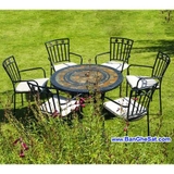 Minh Thy Furniture đầu tư vào hệ thống xử lý chống gỉ và sơn tĩnh điện theo công nghệ hiện đại nhất. Chất sắt vốn đã chắc chắn, nay còn đẹp hơn với lớp sơn tĩnh điện trơn mịn, tươi mới, giúp bàn ghế có thời gian sử dụng lâu dài nhờ lớp sơn bảo vệ dày dặn. Bàn sắt nghệ thuật kết hợp với mặt bàn đá mosaic mang những họa tiết tinh tế, nghệ thuật, làm tôn lên nét cổ điển của bộ sản phẩm.