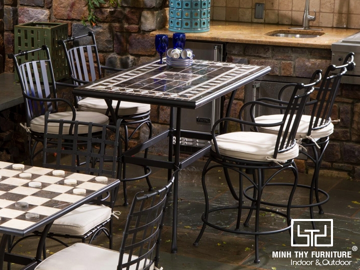 Bàn sắt thường kết hợp sử dụng với mặt bàn đá mosaic mang những kiểu dáng tinh tế, nghệ thuật, bằng nhiều chất liệu khác nhau làm tôn nên nét cổ điển của bộ sản phẩm.