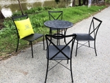 Bàn kết hợp mặt đá hoa cương hoặc đá mosaic cho bàn ghế sắt có nét tinh tế, cổ điển mà không kiểu bàn nào có thể so sánh được. Đây là mẫu cổ điển được các nước phương Tây ưa chuộng. Các mảnh đá nhỏ được xếp với nhau tạo thành các họa tiết đối xứng, cân bằng với đủ loại sắc màu nổi bật.