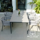 Bộ bàn ghế sử dụng cấu trúc đơn giản nhưng đầy tính nghệ thuật với bàn mặt phẳng sắt tấm và ghế dây dù đan tay thủ công. Gam màu xám trung tính giúp dễ phối hợp với đa dạng phong cách kiến trúc từ hiện đại, tối giản đến mộc mạc tự nhiên.