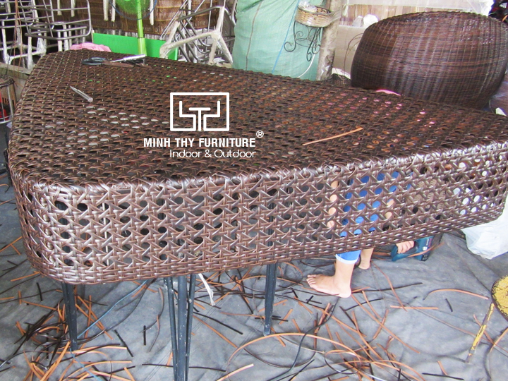 Đôn sofa mây nhựa hình tam giác có vùng đan khá rộng nên để đảm bảo sản phẩm không bị giảm chất lượng trong quá trình sử dụng, những người thợ của Công ty Nội thất Minh Thy sử dụng khá nhiều các đường bắc cầu dưới mê ngồi, tạo thành các đai hình lưới đan xen với nhau, cực kì đàn hồi.