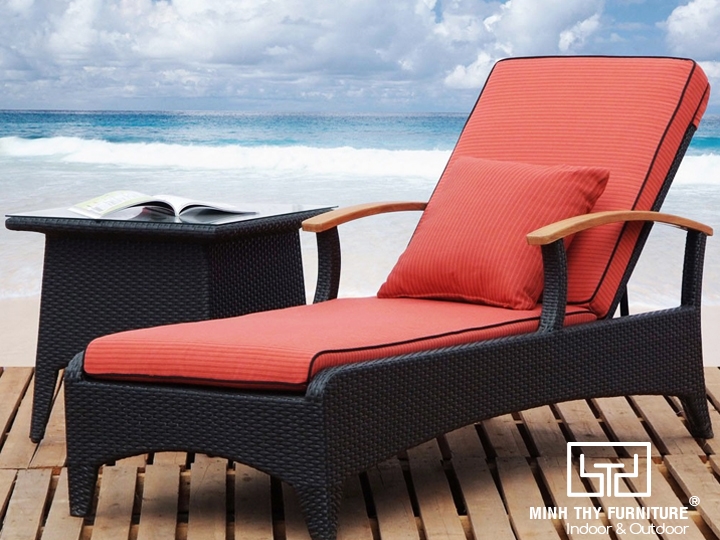Ghế hồ bơi mây nhựa MT431 mang thiết kế với tay vịnh ốp gỗ, tạo điểm tựa vững chắc, thân thiện.