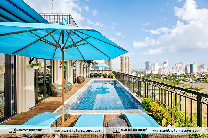 Dưới dây là hình ảnh sản phẩm ghế hồ bơi nhựa giả mây mà Minh Thy Furniture cung cấp tại The Herriott Hotel & Suite