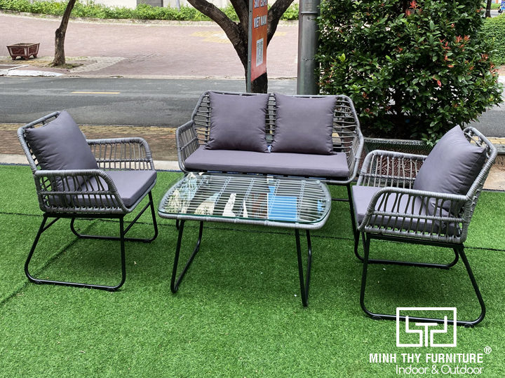 Các mẫu sofa này thường được làm từ nhựa giả mây, gỗ hoặc hợp kim chống gỉ, có thiết kế sang trọng, màu sắc trung tính hài hòa với cảnh quan thiên nhiên.